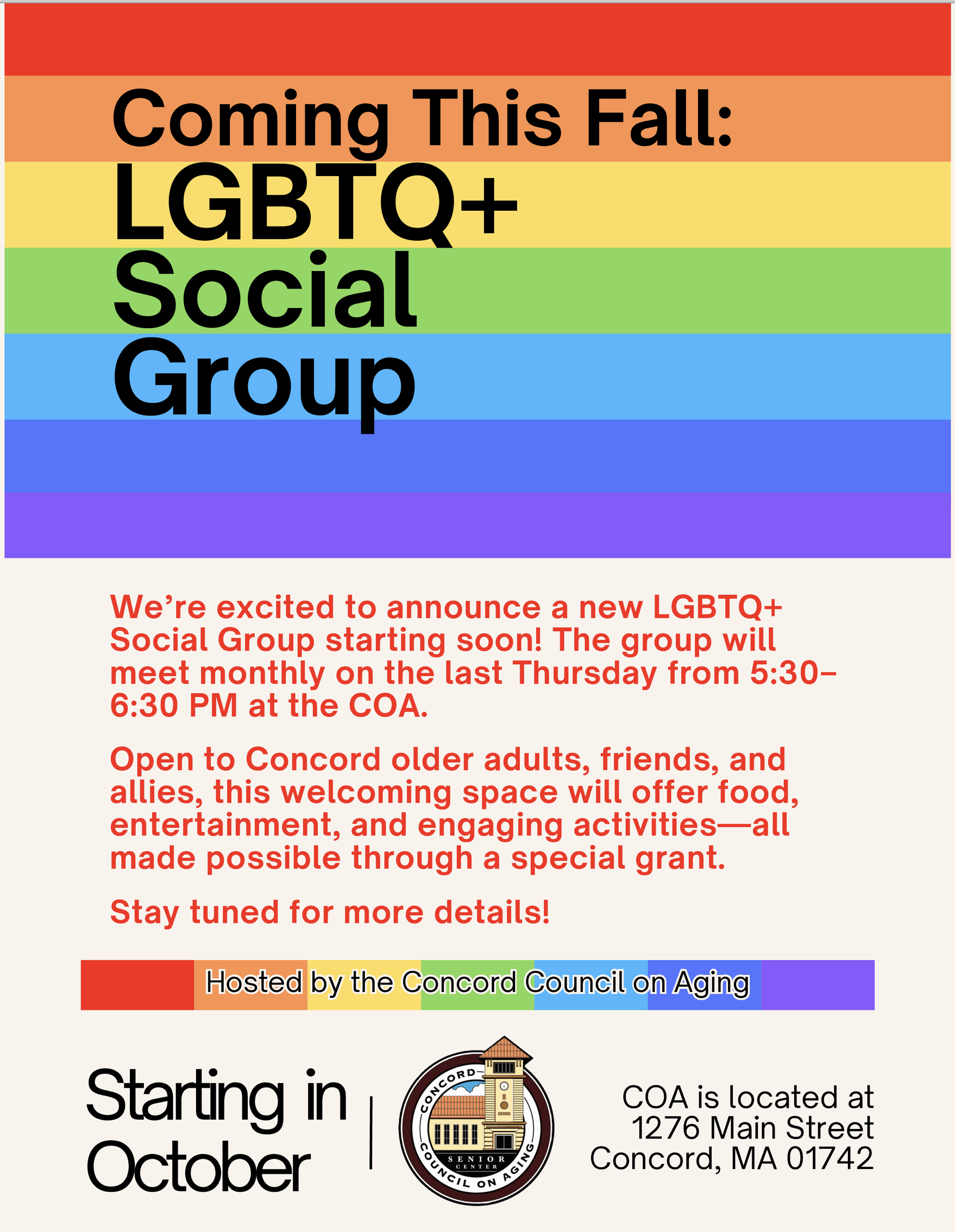 We’re excited to announce a new LGBTQ+ Social Group starting in October! The group will meet monthly on the last Thursday of each month from 5:30 PM to 6:30 PM at the COA. Open to Concord older adults, friends, and allies, this welcoming space will offer food, entertainment, and engaging activities, all made possible through a special grant. Stay tuned for more details!